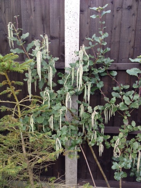 This stroke of genius came when I ventured out to get something from the shed (can't even remember what now and it was only yesterday) and saw how lovely the Garrya elliptica looks at the moment... tucked down at the end of the garden 'behind' the Viburnum opulus that sticks out miles into the middle of the garden, the Garrya just isn't seen at this time of year. And this is its moment. (Ignore the dodgy looking Christmas tree next to it.)